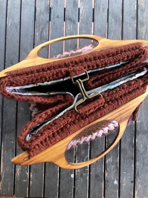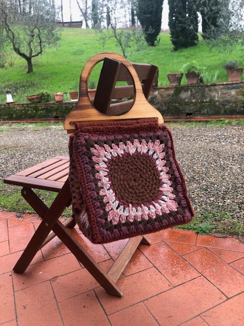 Five wool crocheted grannysquares form this large cube bag with wood handles.