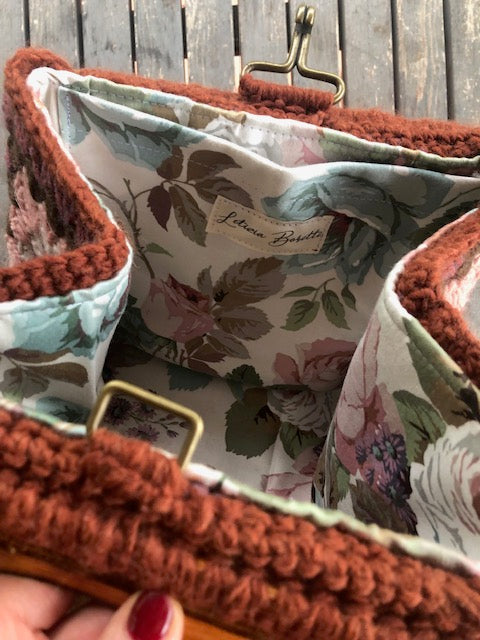 It is lined with a very pretty Sanderson printed cotton satin, with a large pocket on a side and a metal closure on the top.