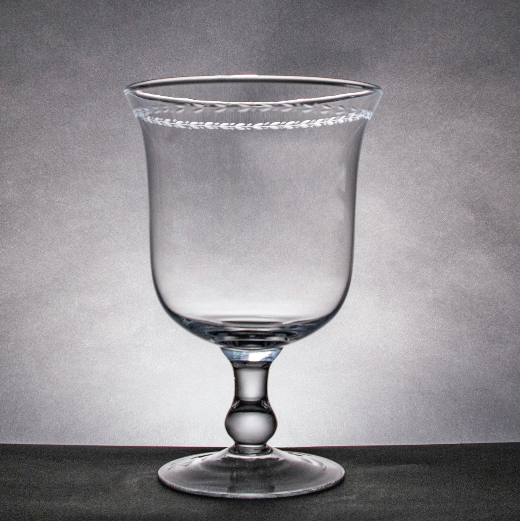 Reproduction of a celebration goblet, flower vase or candle holder, in crystal engraved with leaves