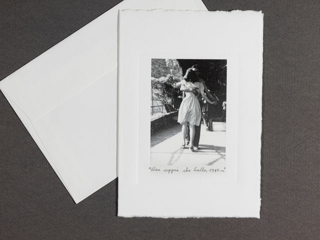 Kit of 3 Cards on cotton paper, format 11x17 cm with an Alinari image printed on the front (Coupple Dancing, Calla lily flower, A daytrip on a Vespa). Complete with envelope.