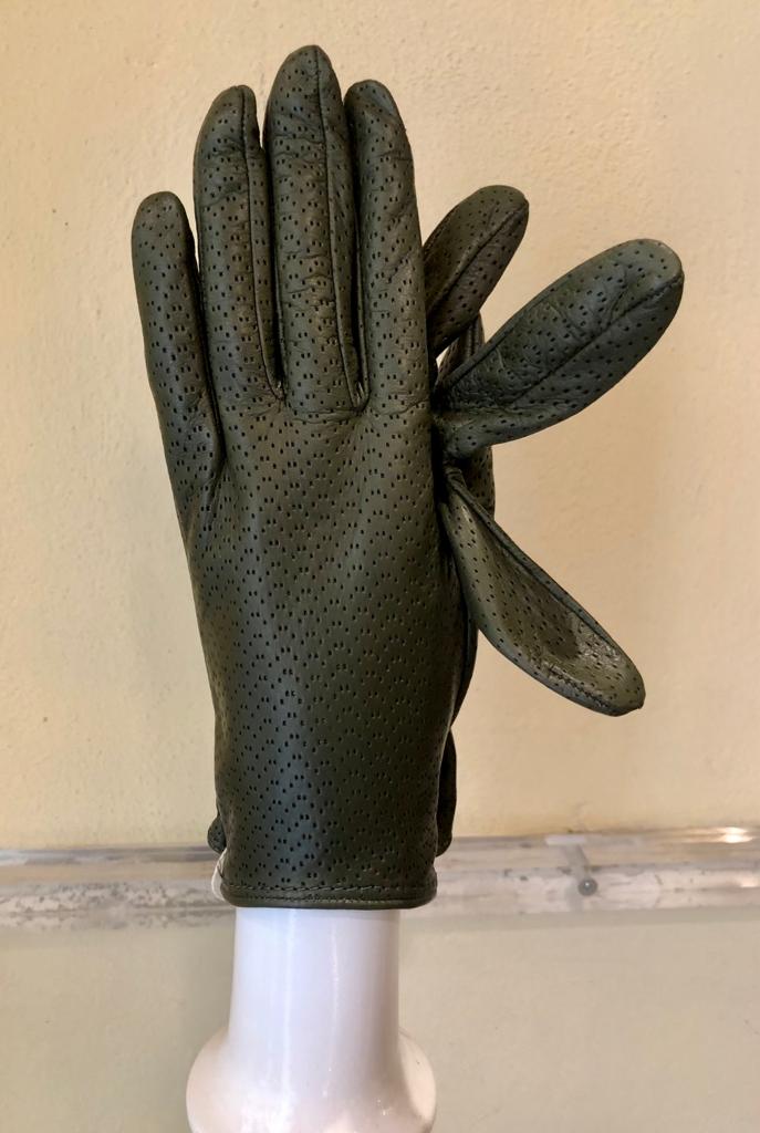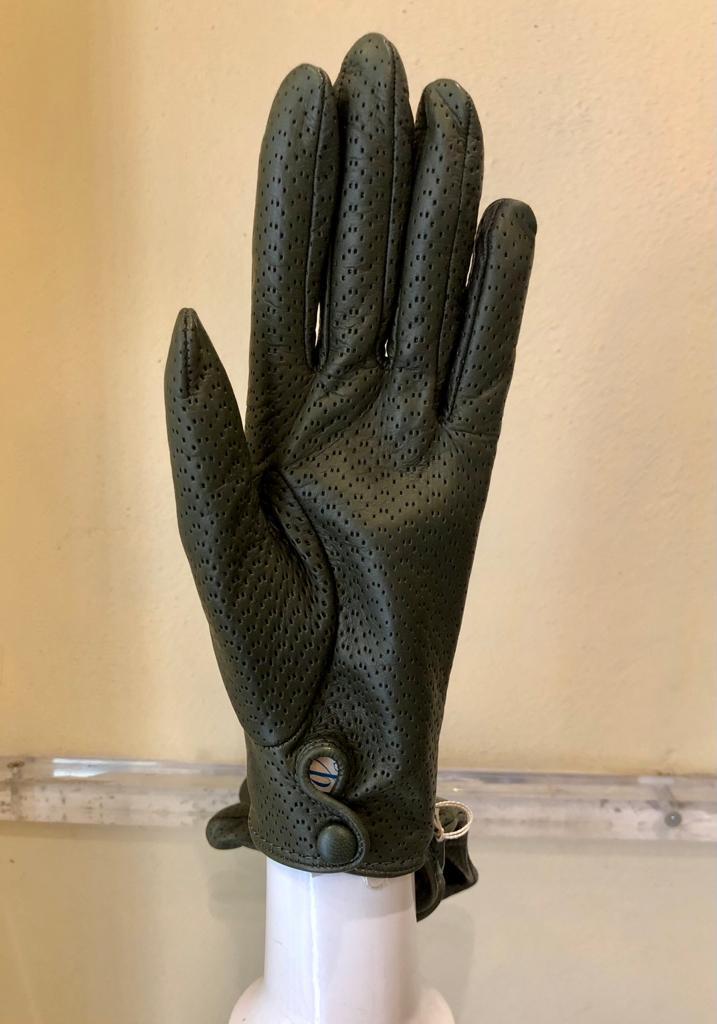 Description: ladies short leather gloves, light weight with perforated leather and Back snap button.