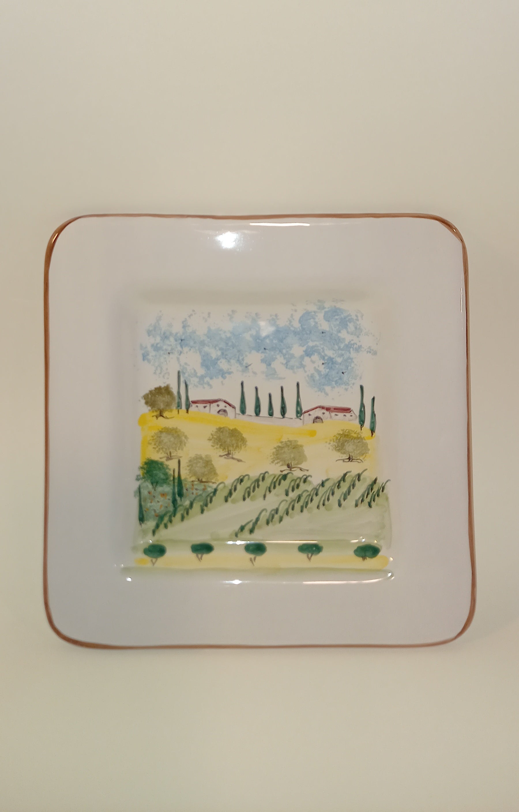 The image is representative of the decoration, but every single object is unique and always different from the others. This square plate can be used for small appetizers, crackers, cheeses or even have a decorative use as it can also be used as a wall plate. It is a little piece of Tuscany in your home.