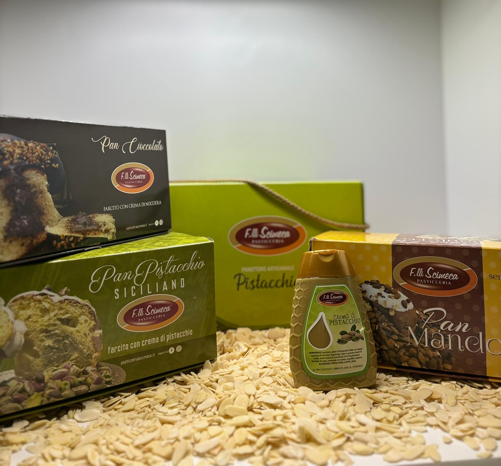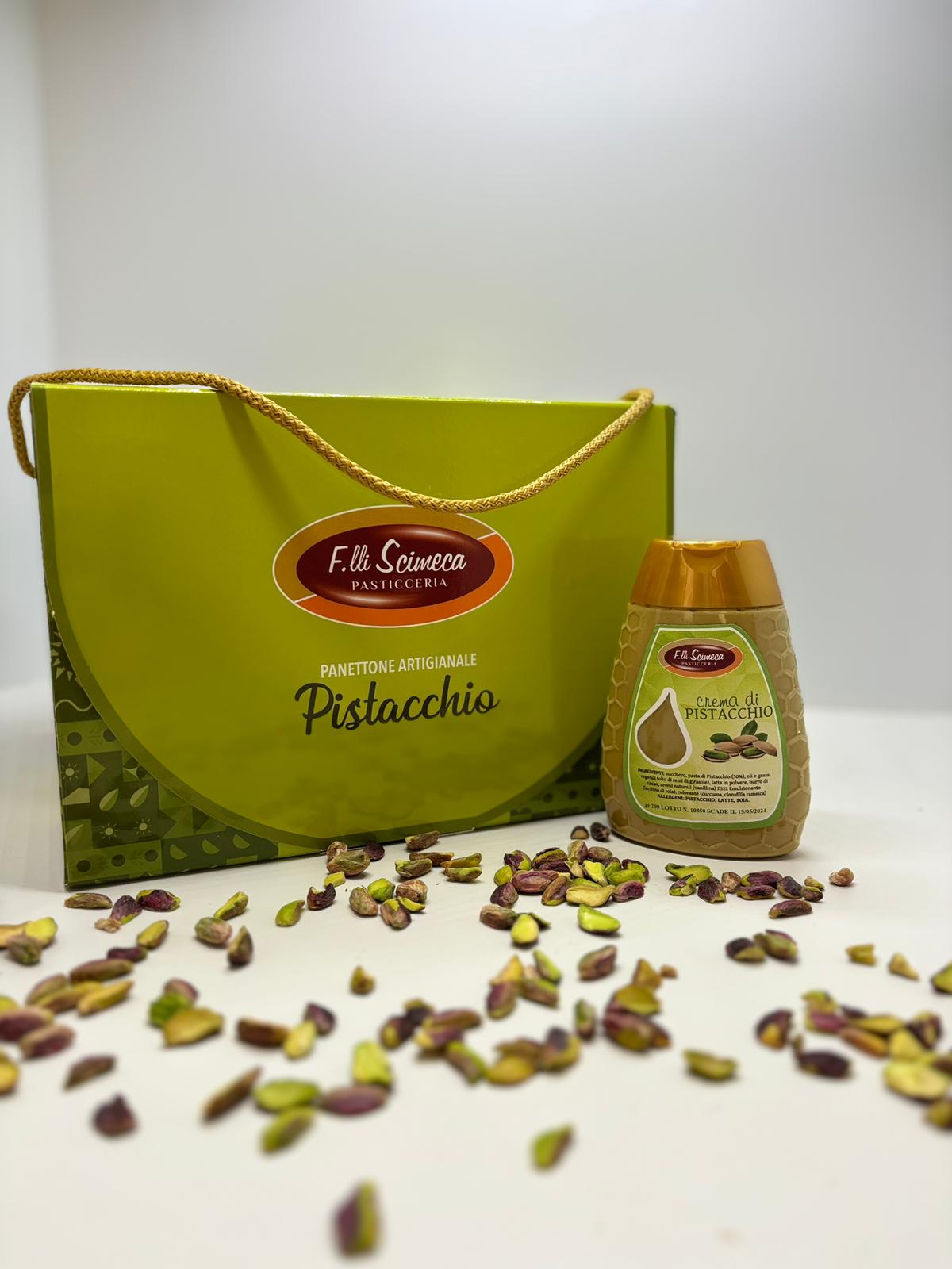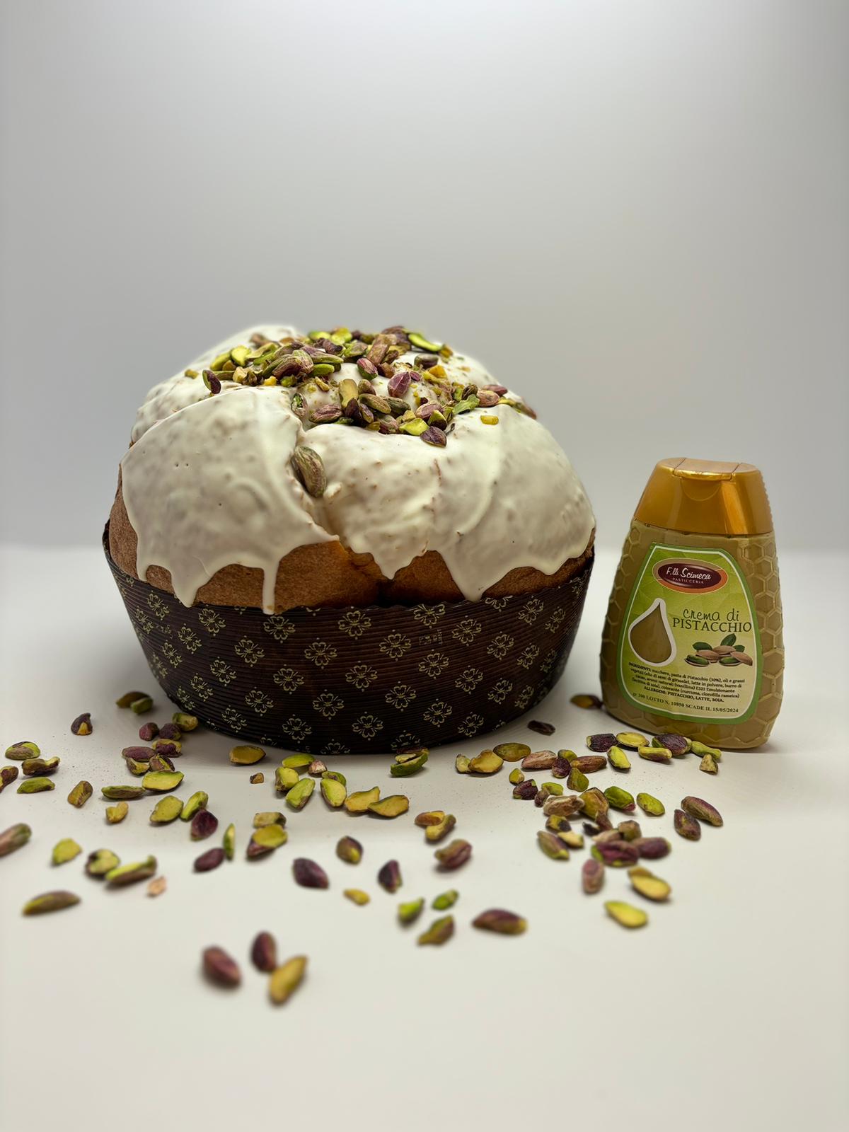 n°1 Pistachio Panettone: Panettone naturally leavened and worked by hand following the traditional Sicilian confectionery recipe. Stuffed with drops of pistachio chocolate and covered with an exquisite glaze and enriched with whole shelled pistachios. It contains,also, No. 1 squeezer with creamy pistachio spread.