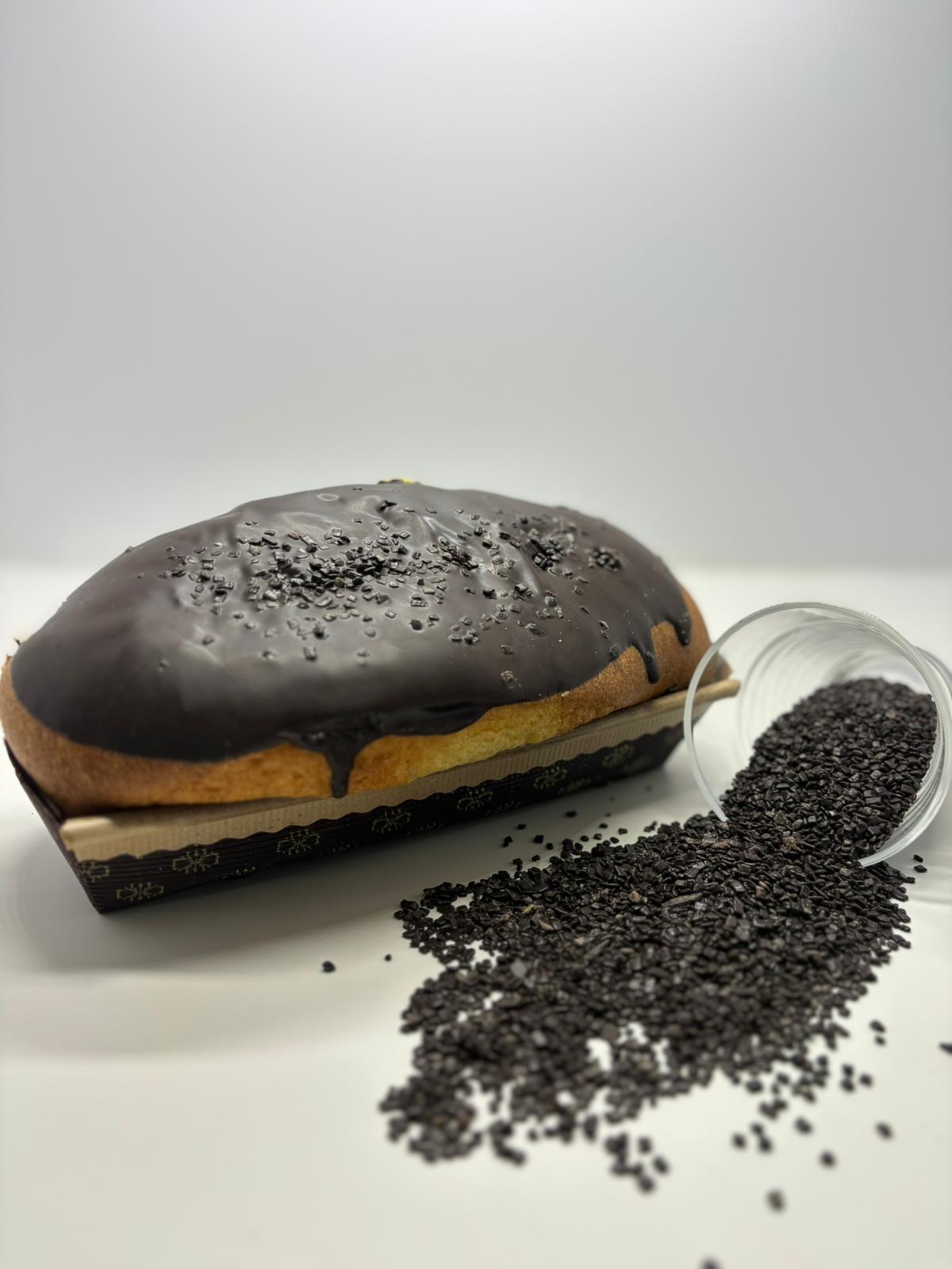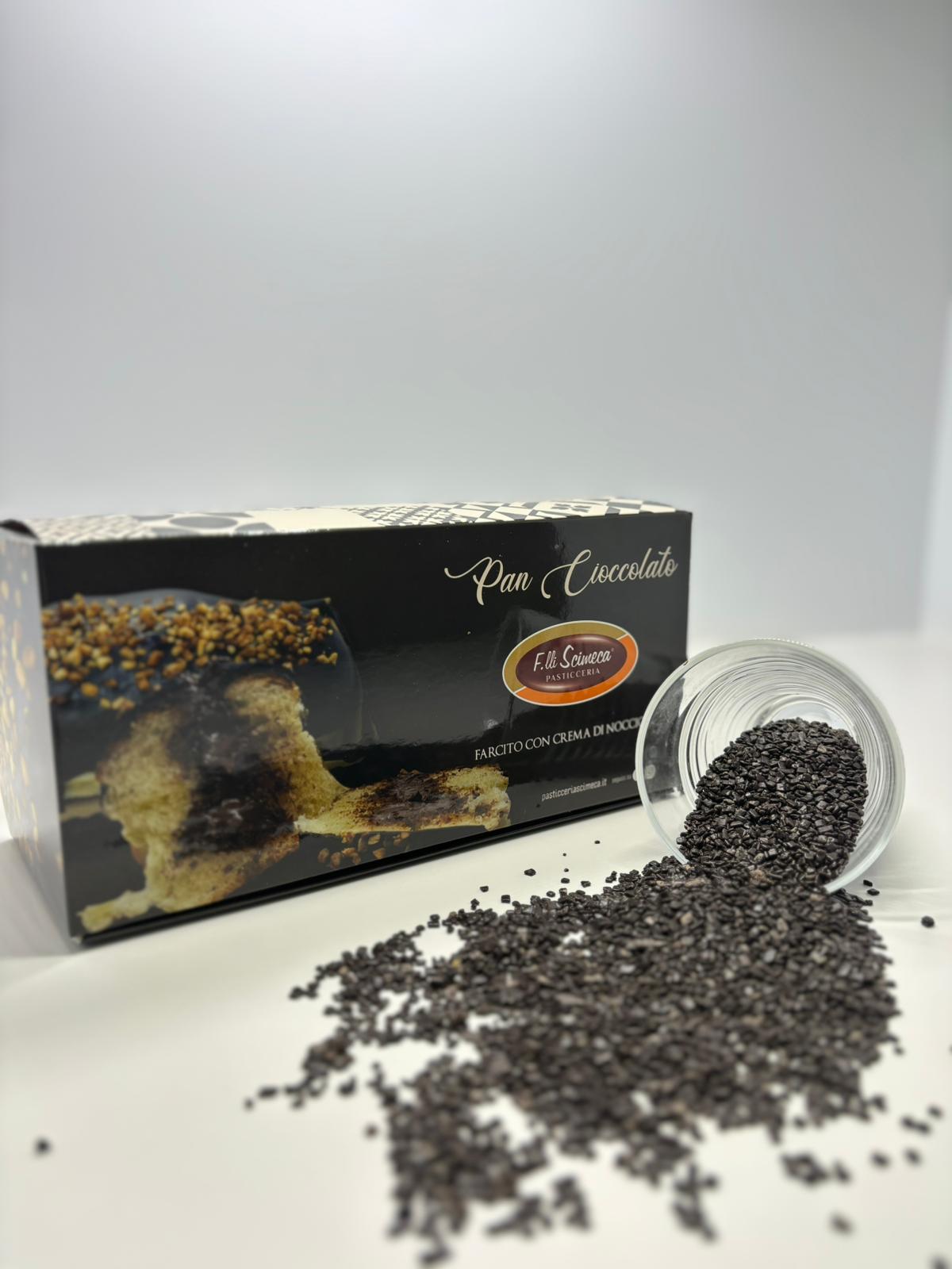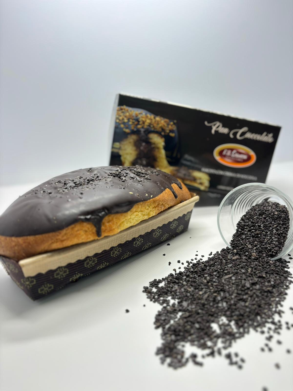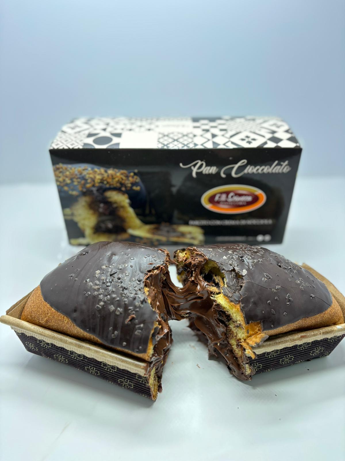 No. 1 Pan Cioccolato: Revisiting in a modern key the traditional Panettone traditional in the 300gr size. Stuffed inside with hazelnut cream and externally frosted with dark chocolate and chopped hazelnuts.