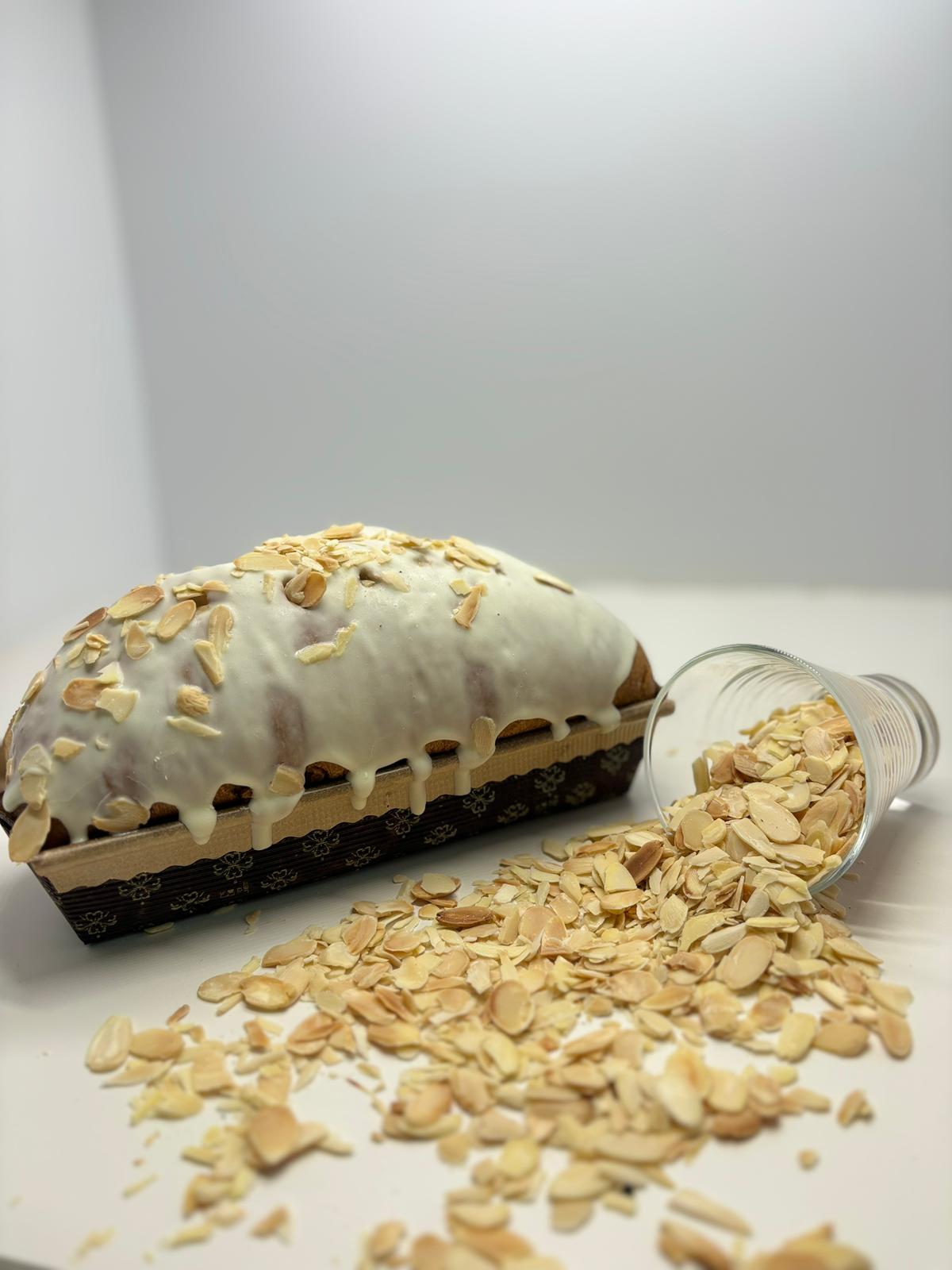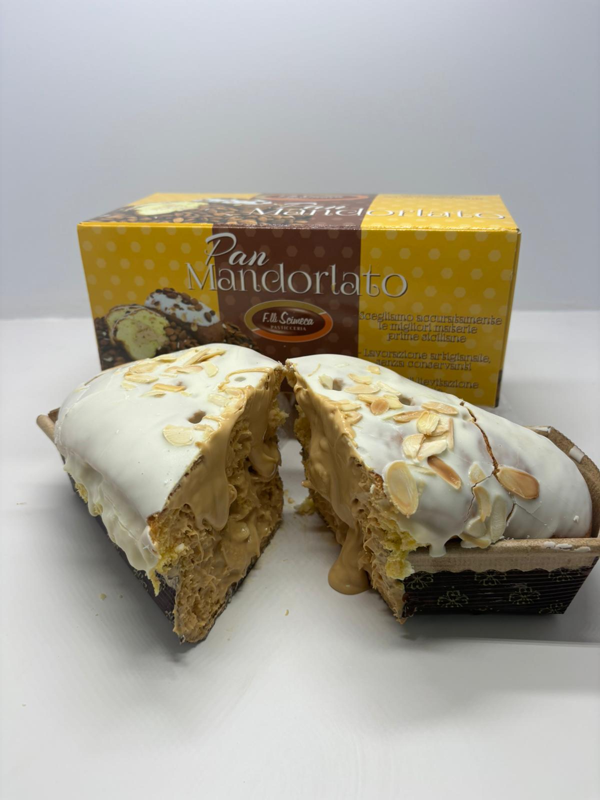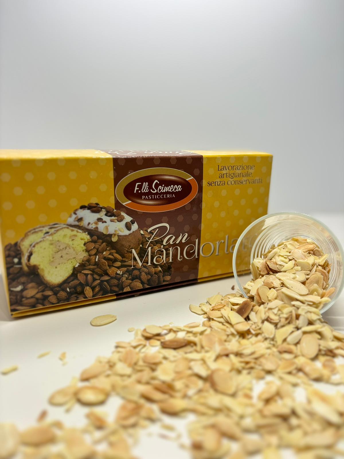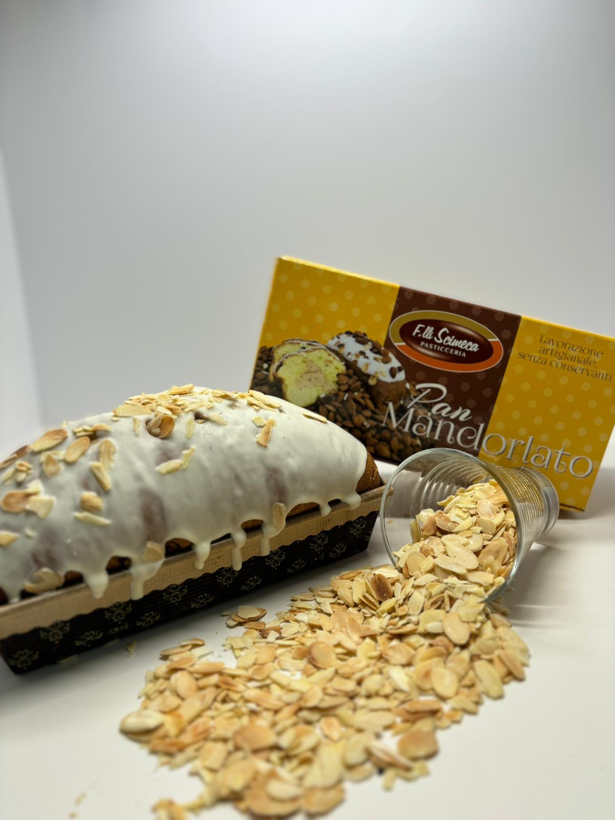 n°1 Pan Mandorlato: A modern take on the traditional Panettone in the 300gr size. Stuffed inside with cream of almond and externally frosted and covered with whole almonds.