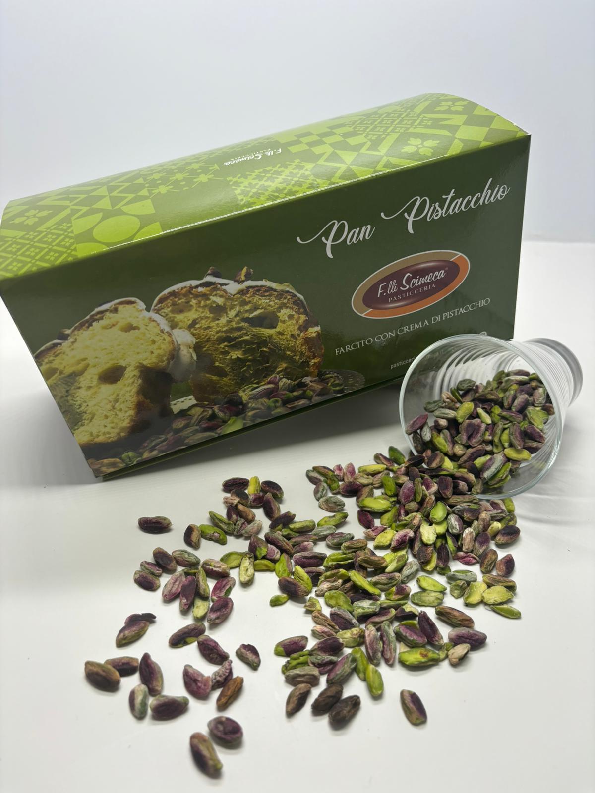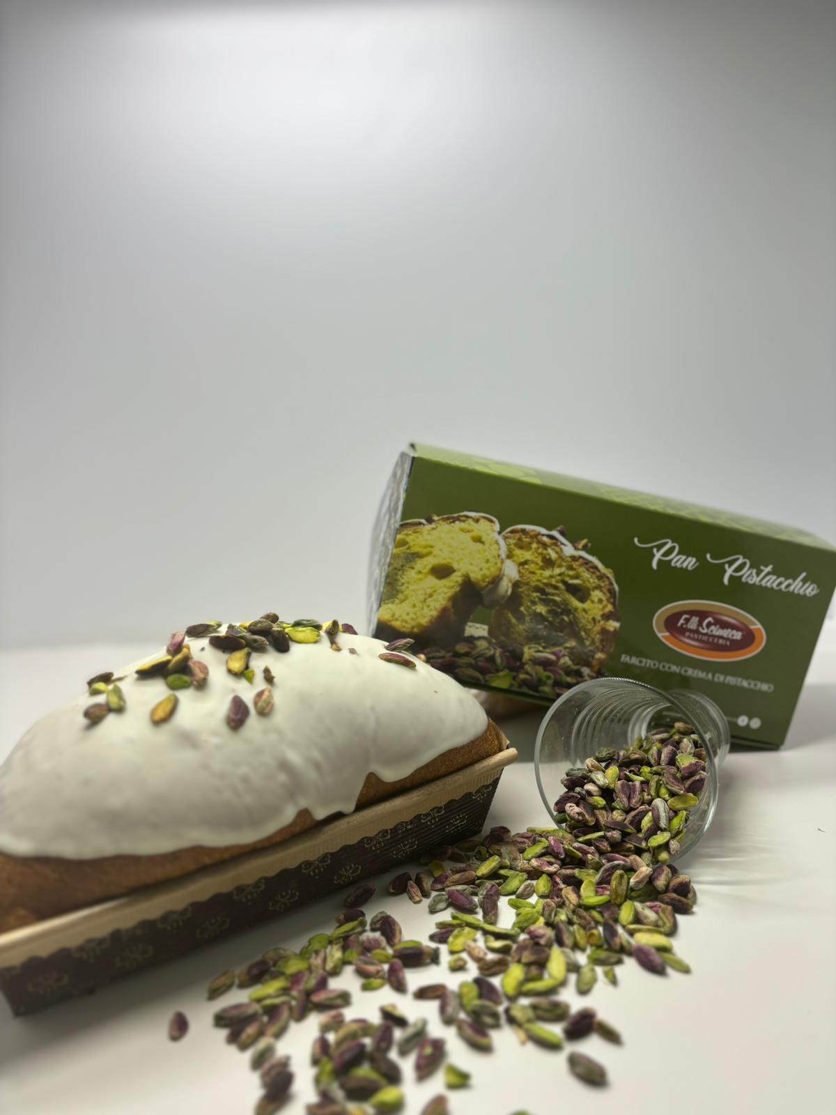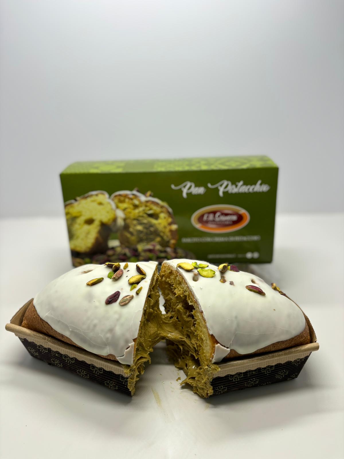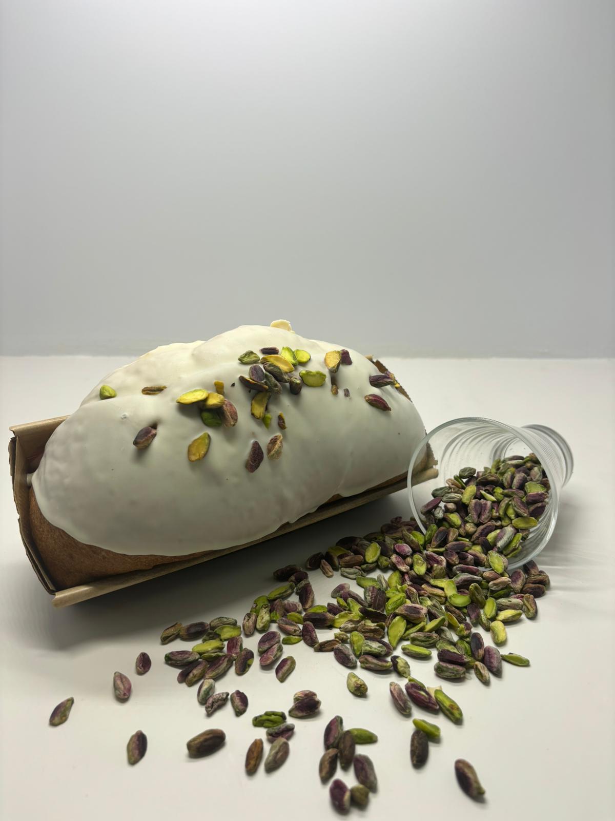 No. 1 Pistachio Pan: Revisiting the traditional Panettone in a modern key in the 300gr format. Stuffed inside with pistachio cream and externally frosted and covered with shelled pistachios.